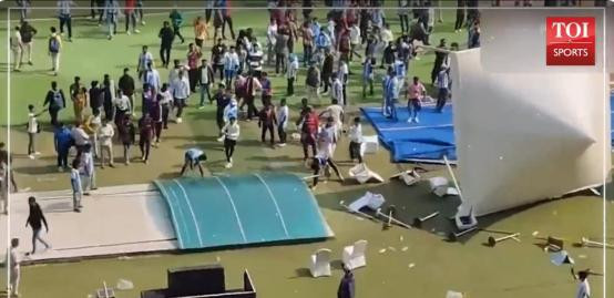 愤怒的球迷开始向场内投掷水瓶、拆毁座椅并冲进场地,现场陷入全面混乱。