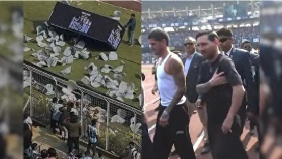 失望迅速转化为愤怒。梅西离场后,球迷开始向场内投掷水瓶,拆卸并投掷玻璃纤维座椅,甚至试图破坏看台间的围栏。